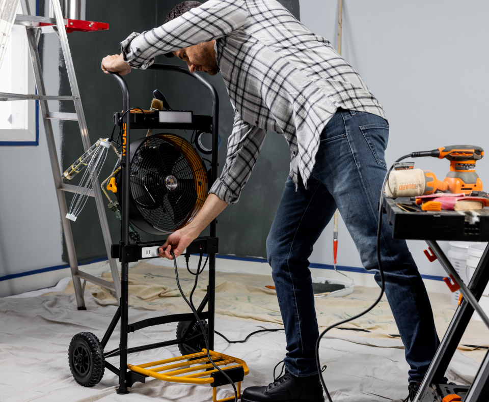 MULE 5-in-1 Mobile Workshop, integrated 3-speed fan, LED light, power strip, tool caddy, and 300lb capacity hand truck Designed to make everything ...